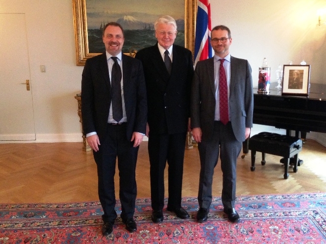 Kristján Andri Stefánsson og Tim Ward, tveir lögfræðinganna sem fluttu mál Íslands fyrir EFTA dómstólnum, ásamt forseta á Bessastöðum.