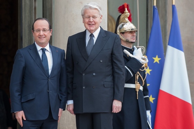 Hollande, forseti Frakklands, og forseti Íslands á tröppum frönsku forsetahallarinnar.