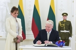 Forseti skrifar nafn sitt í hátíðargestabók forsetahallarinnar. Ljósmyndari Robertas Dackus.