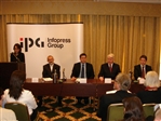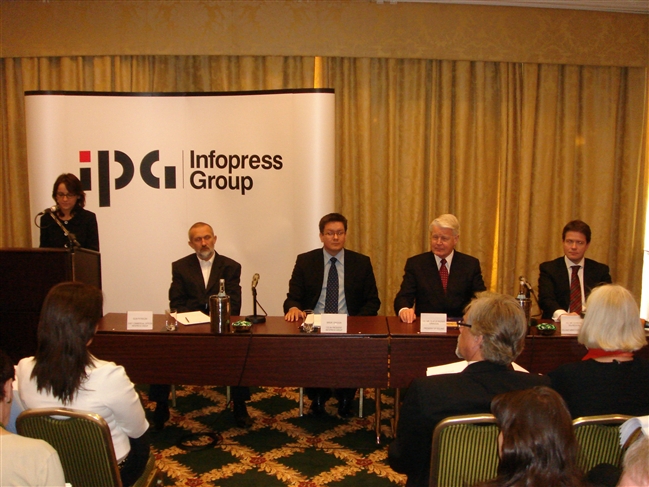 Frá blaðamannafundi Infopress í Búkarest. Lengst til hægri sitja forseti og viðskiptaráðherra, en næst forseta er Birgir Jónsson forstjóri Infopress Group.