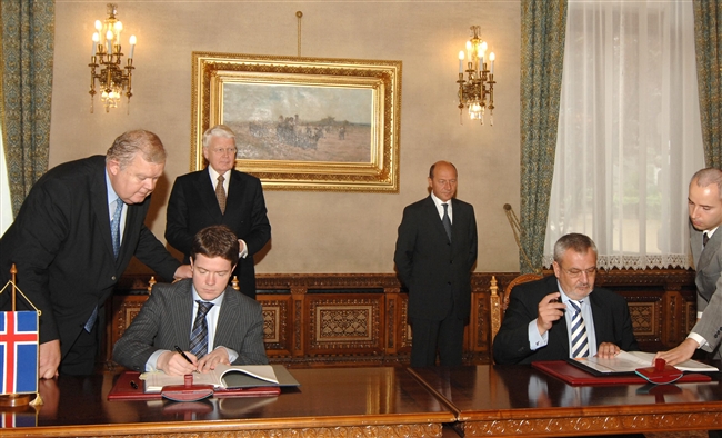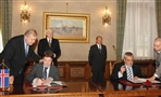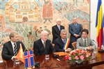 Björgvin Sigurðsson viðskiptaráðherra og Sebastian Vladescu ráðuneytisstjóri undirrita samning um skattamál að viðstöddum forseta Íslands og forseta Rúmeníu