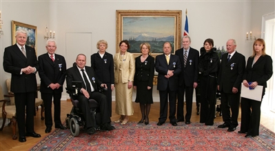 Orðuveiting 17. júní 2007. Frá vinstri: Ólafur Ragnar Grímsson forseti Íslands, Björn R. Einarsson hljómlistarmaður, Guðjón Sigurðsson formaður MND samtakanna, Guðrún Kvaran orðabókarritstjóri, Áslaug Sigríður Alfreðsdóttir hótelstjóri, Margrét Friðriksdóttir skólameistari, Pétur Sveinbjarnarson stjórnarformaður Sólheima, Kristján Sæmundsson jarðfræðingur, Steinunn Sigurðardóttir hönnuður, Ásgeir J. Guðmundsson iðnrekandi og Auður Jónsdóttir barnabarn Sverris Hermannssonar safnamanns.