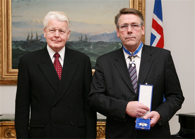 Forseti sæmdi í dag Jóannes Eidesgaard, lögmann Færeyja, stórriddarakrossi með stjörnu fyrir framlag hans til að styrkja samvinnu Íslendinga og Færeyinga. Veiting fálkaorðunnar fór fram við hátíðlega athöfn á Bessastöðum.