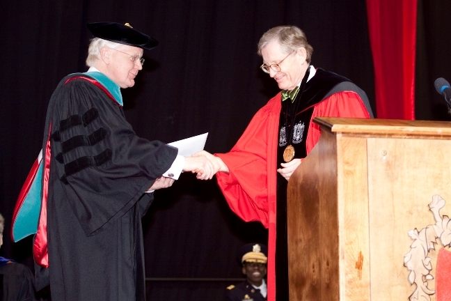 Gordon Gee rektor Ríkisháskólans í Ohio sæmir forseta nafnbót heiðursdoktors. Ljósmyndari: Kevin Fitzsimons.