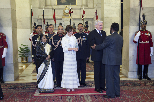 Forseti Indlands Pratibha Patil og forsetahjón í hinni sögufrægu forsetahöll Rashtrapati Bhavan í Delí.