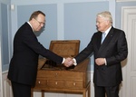 Ragnar Önundarson fyrir hönd gefenda og forseti Íslands handsala gjöfina.