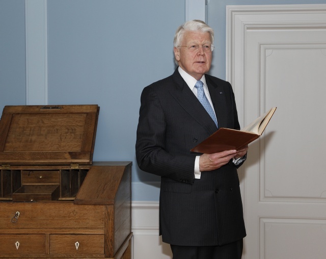 Forseti ávarpar gesti við púlt Sveinbjarnar Egilssonar.