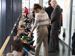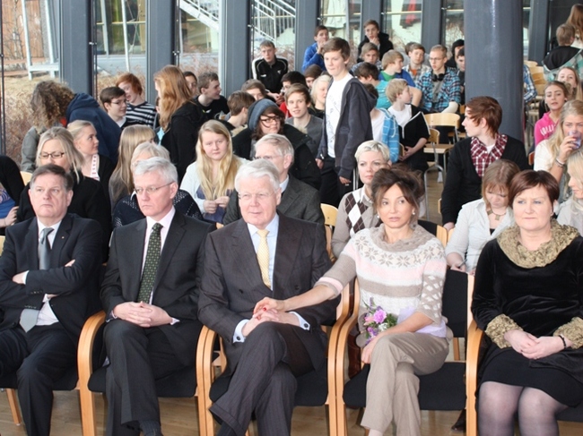 Gestir og heimamenn koma sér fyrir í samkomusal Lækjarskóla í Hafnarfirði.