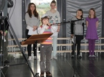 Nemendur úr Lækjarskóla flytja tónlistaratriði á samkomu með forseta.