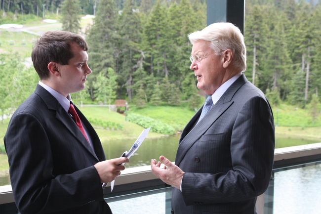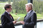 Forseti ræðir við blaðamann á ráðstefnunni í Alaska