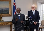 Kofi Annan ræðir við fréttamenn á Bessastöðum.