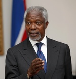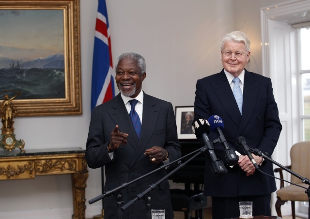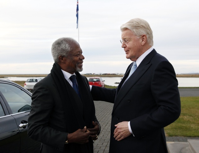 Kofi Annan á fréttamannafundi með forseta Íslands á Bessastöðum.