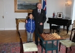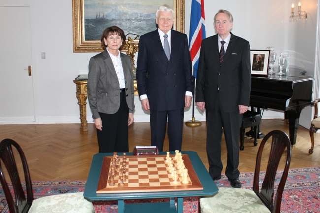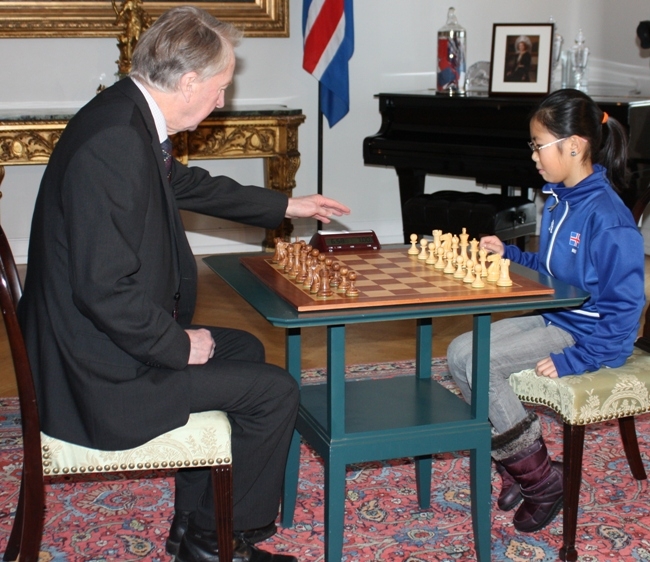 Friðrik Ólafsson og Nancy Davíðsdóttir taka stutta skák á Bessastöðum.