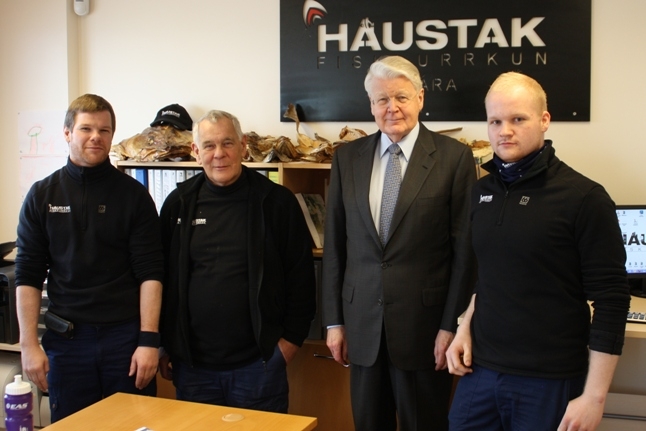 Við upphaf heimsóknar forseta til Haustaks - fiskþurrkunar á Reykjanesi; Víkingur Þórir Víkingsson, Víkingur Halldórsson og Halldór Smári Ólafsson.