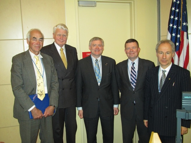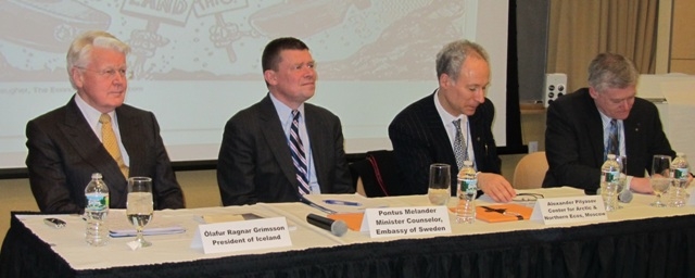Frá vinstri Crocker Snow, forseti Íslands, Mead Treadwell vararíkisstjóri Alaska, Pontus Melander og Alexander Pilyasov eftir pallborðsumræður á ráðstefnu Tufts háskólans.