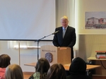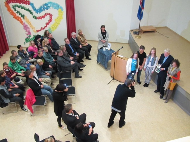 Forseti ávarpar nemendur Myllubakkaskóla.