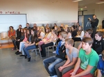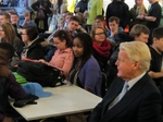 Nemendur níunda bekkjar hlusta á ávörp í matsalnum.