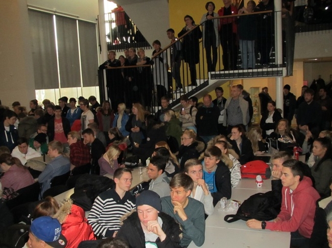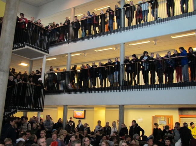 Hlustað á boðskap dagsins í Fjölbrautaskóla Suðurnesja.