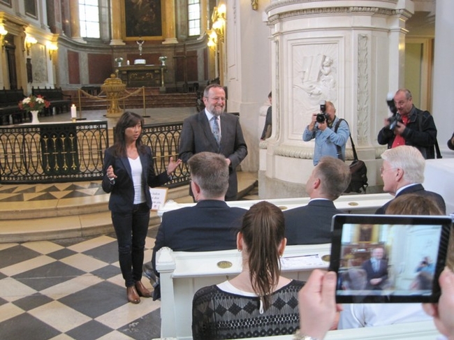 Hlýtt á leiðsögn um Nikulásarkirkju í Leipzig en þar urðu vikulegar bænastundir friðarsinna kveikjan að mótmælum sem veltu alræðisstjórninni árið 1989.