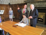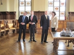Forsetafrúin ritar nafn sitt í heiðursgestabók Leipzigborgar en forseti hlustar á lýsingu borgarstjórans á veggskrauti í ráðhúsinu.