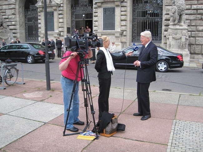 Rætt við fréttamann RÚV fyrir framan nýja ráðhúsið í Leipzig.