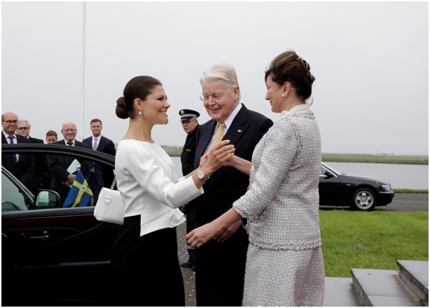 Forsetahjón heilsa Viktoríu krónprinsessu á tröppum Bessastaða.