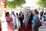 Skólastúlkur bjóða forseta og aðra gesti velkomna.