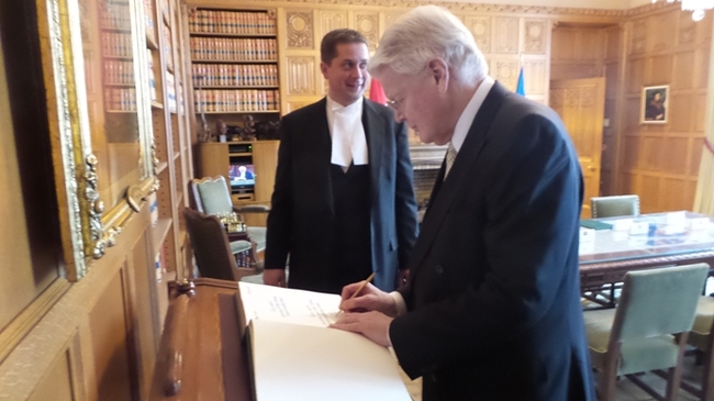 Forseti áritar gestabók í kanadíska þinginu.