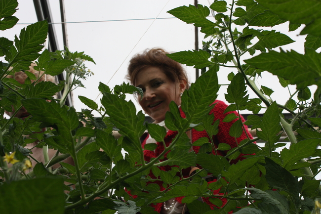 Forsetafrú skoðar tómataplöntur