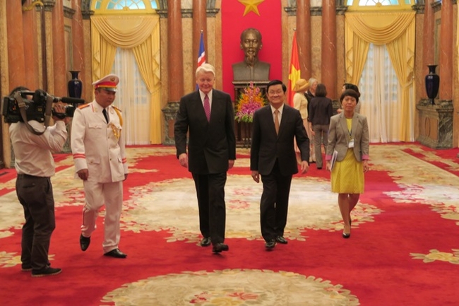 Forsetar Íslands og Víetnams ganga til viðræðufundar síns.