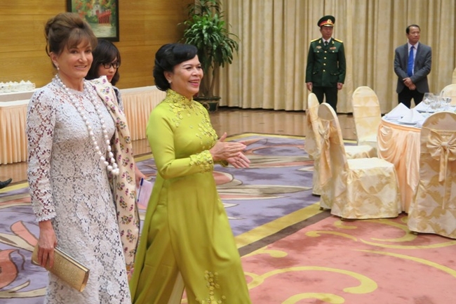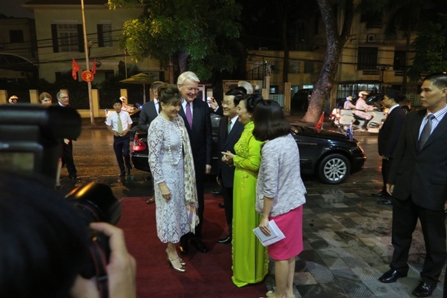 Forsetafrúin og forsetafrú Víetnams, frú Mai Thi Hanh, koma til hátíðarkvöldverðar í Hanoi.