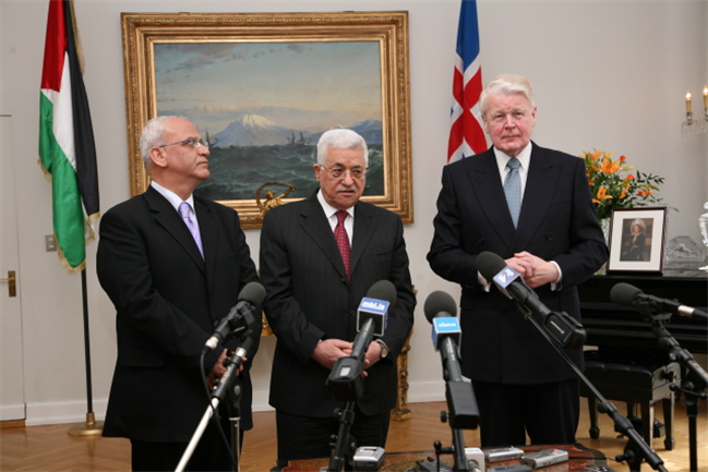 Forsetarnir ásamt dr. Saeb Erekat samningafulltrúa Palestínuforseta
