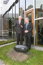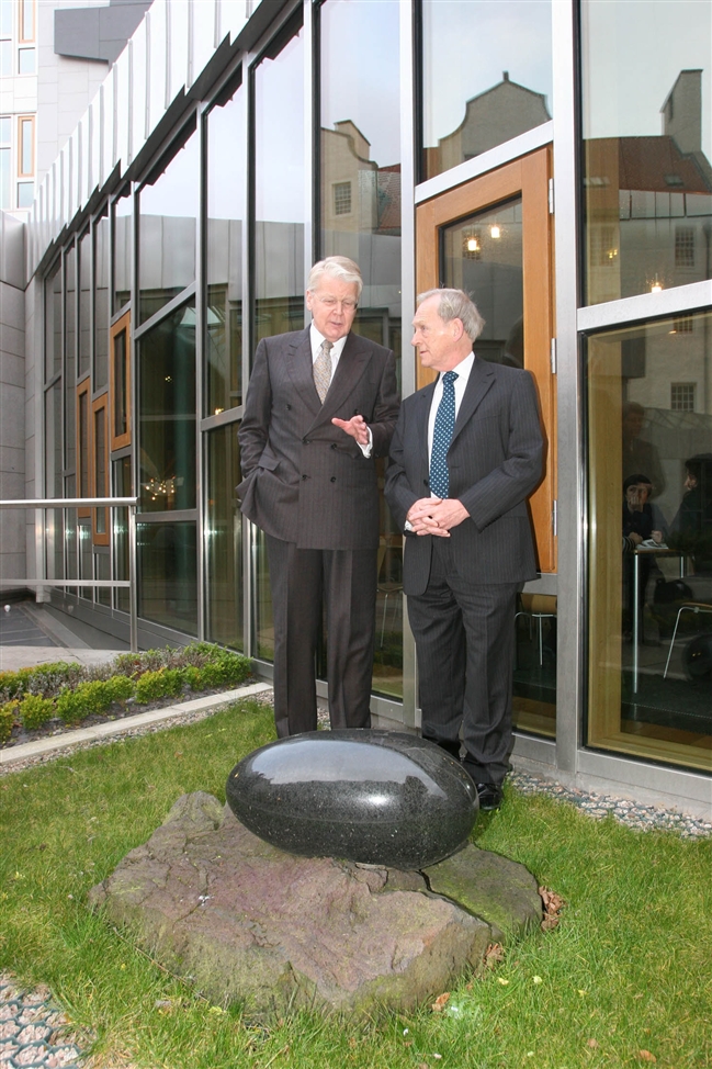 Forseti Íslands með forseta skoska þingsins George Reid við gjöf Alþingis. Letrað er á steininn ,,Með lögum skal land byggja"