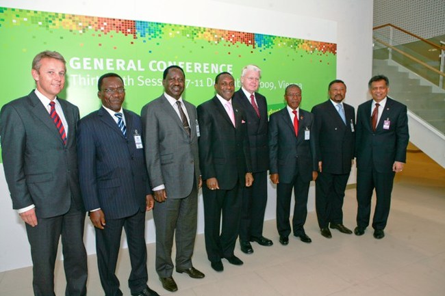 Í hópi leiðtoga á þingi UNIDO í Vín. Forseta til hægri handar stendur Yumkella, framkvæmdastjóri samtakanna.