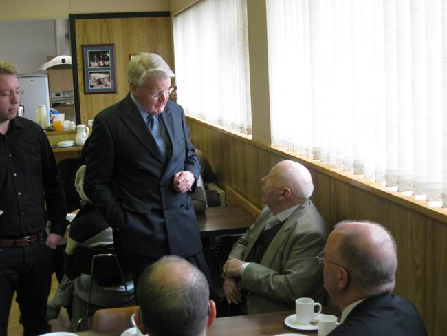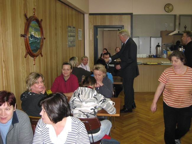 Forseti heilsar upp á starfsmenn fiskvinnslu Guðmundar Runólfssonar í kaffitíma.