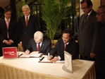 Lárus Welding og dr. Pachauri undirrita samning fyrir hönd Glitnis og TERI að forseta viðstöddum.