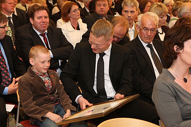 Halldór B. Ívarsson sýnir syni sínum verðlaunaskjalið.